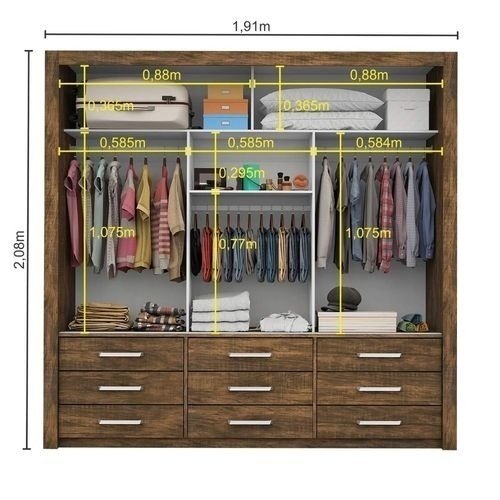 Guarda roupa com maior resistência, durabilidade e acabamento, revestimento interno e externo: pintura em estufas modernas com uv (ultra violeta), são túneis que secam os produtos através de lâmpadas especiais que reproduzem artificialmente os raios ultravioletas do sol. Modelo com corrediça metálica em aço, 9 gavetas espaçosas, perfil em alumínio, roldanas de aço carbono com rolamento, divisão ele/ela.
